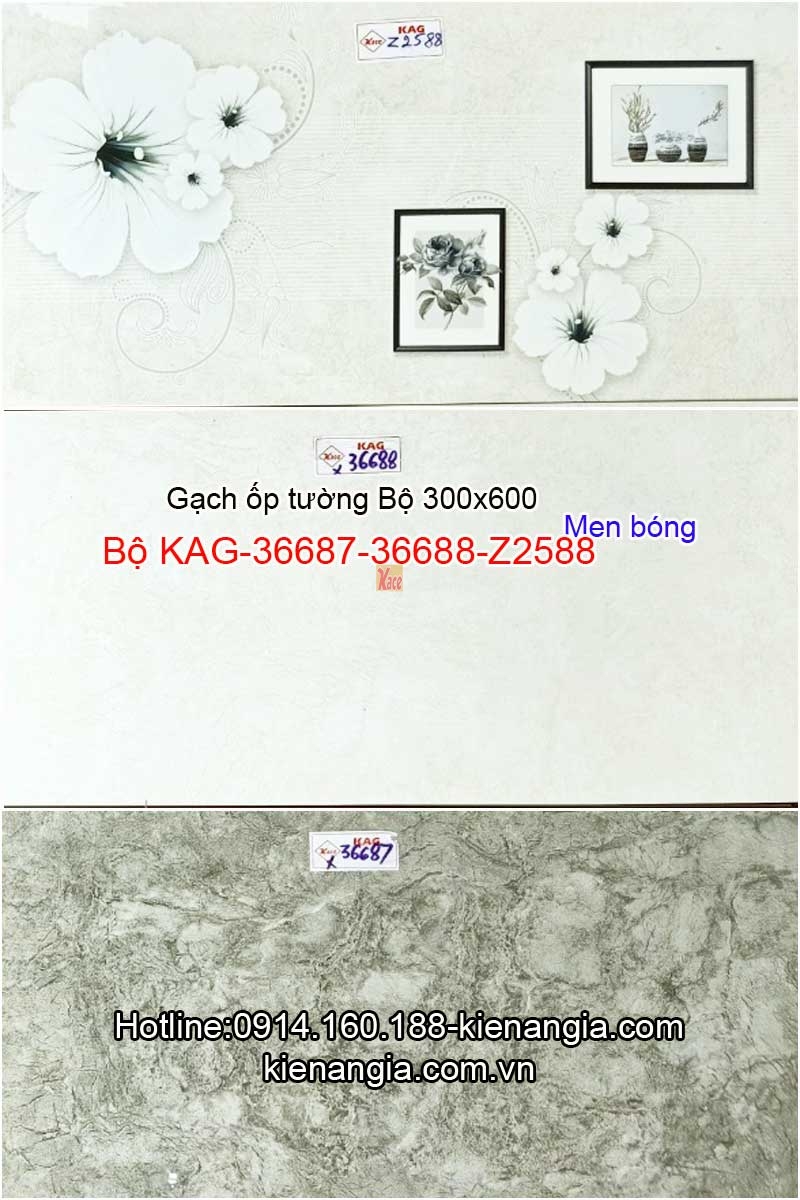 Gạch ốp tường 30x60 Bộ KAG-36687-36688-Z2588 mẫu mới 2019 giá rẻ KIẾN AN GIA-0914.160.488 ốp tường phòng khách,phòng tắm,phòng ngủ nhà phố,khách sạn,nhà cho thuê .Phối hợp màu đậm,nhạt ,điểm hay có viền rất đẹp,đơn giản nhưng sang trọng.Giá niêm yết tại đây tính trên m2 cho gạch đậm,nhạt,không viền.Gõ mã số gạch điểm vào ô tìm kiếm trên kienangia.com.vn để biết giá gạch điểm tính theo viên